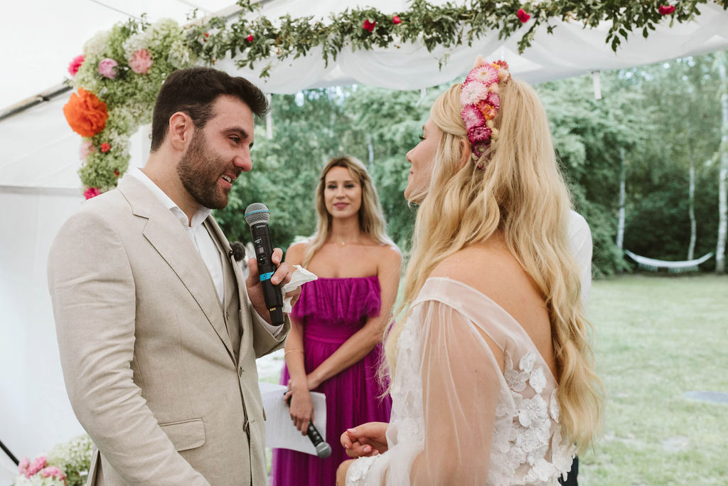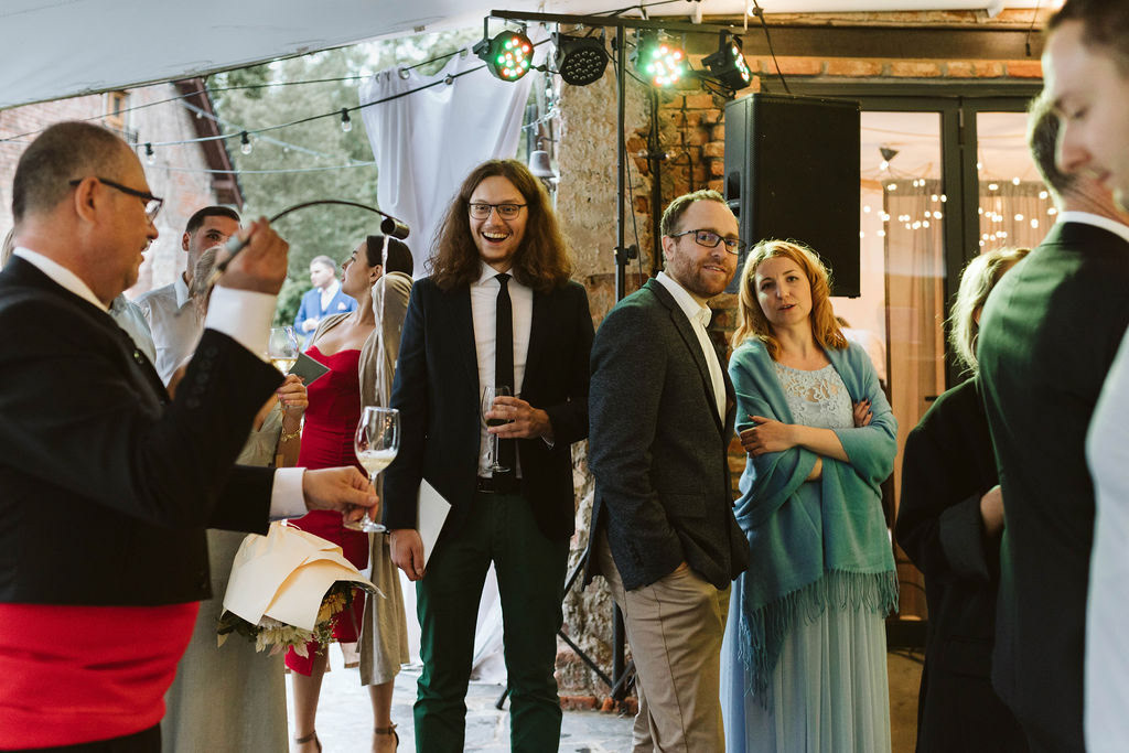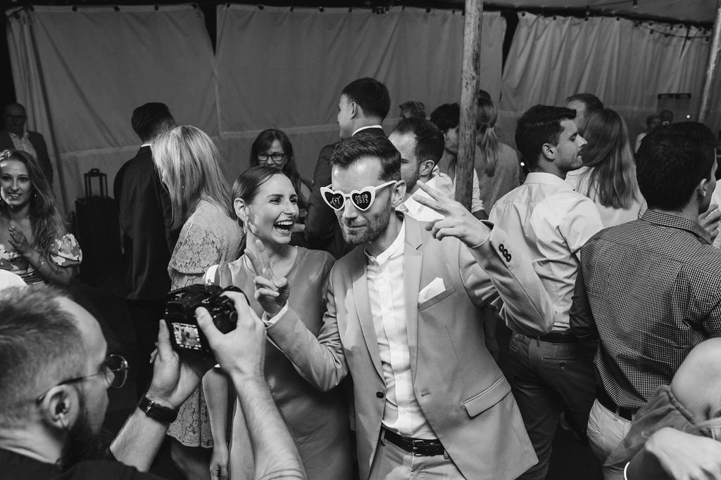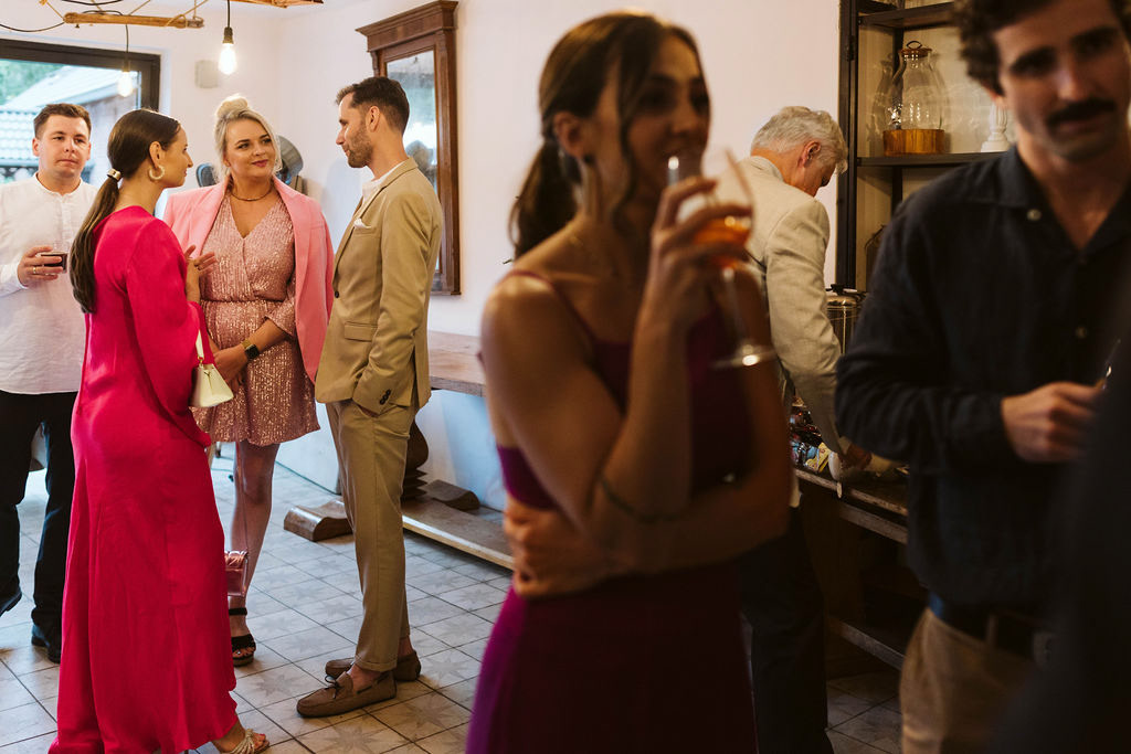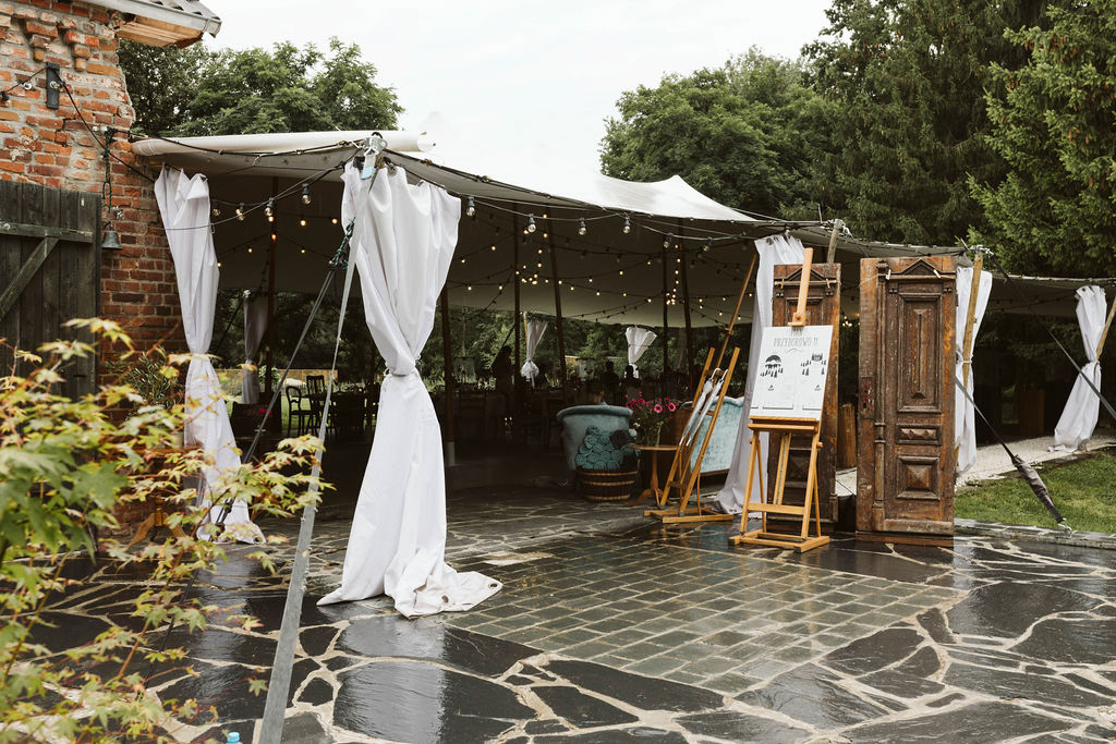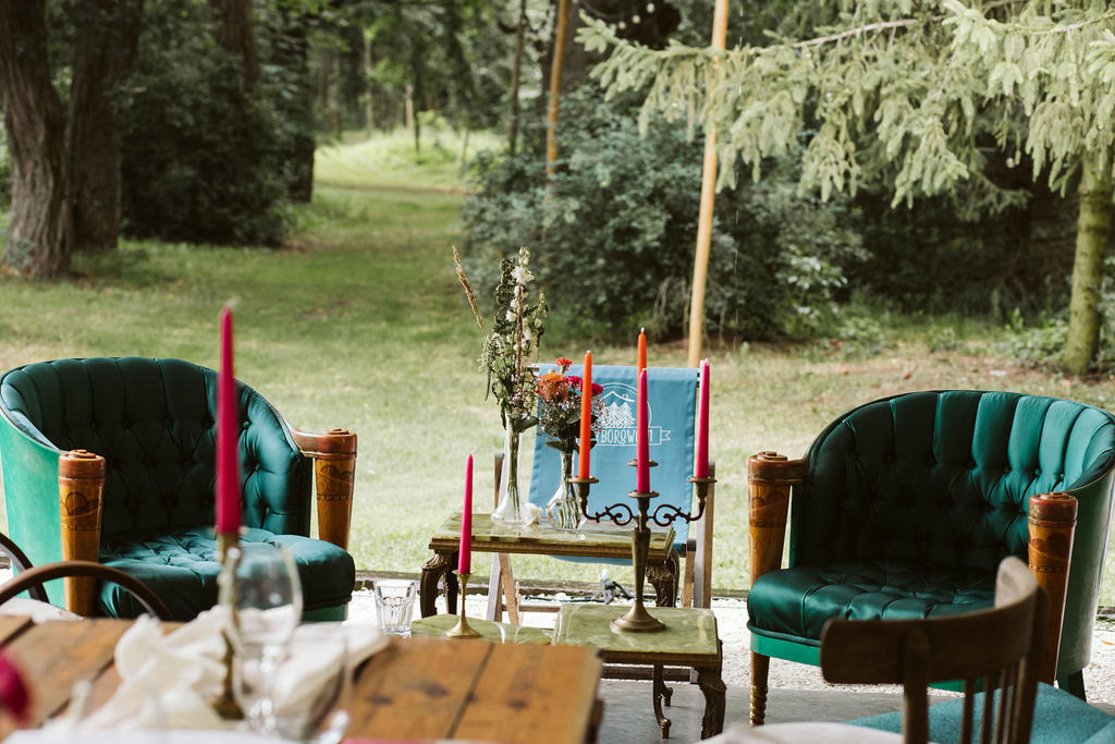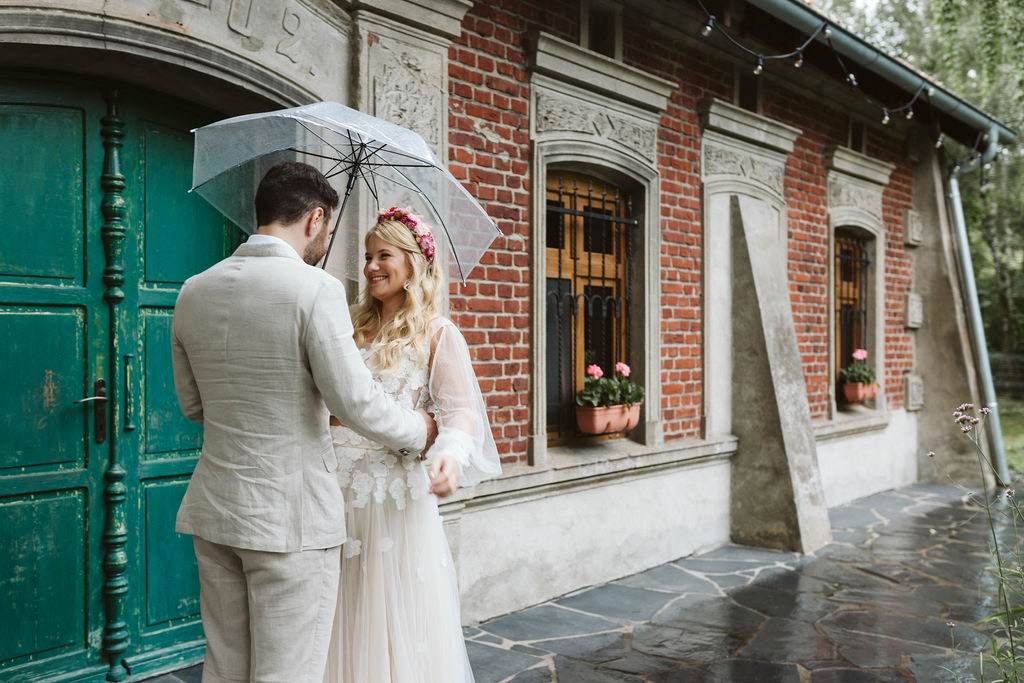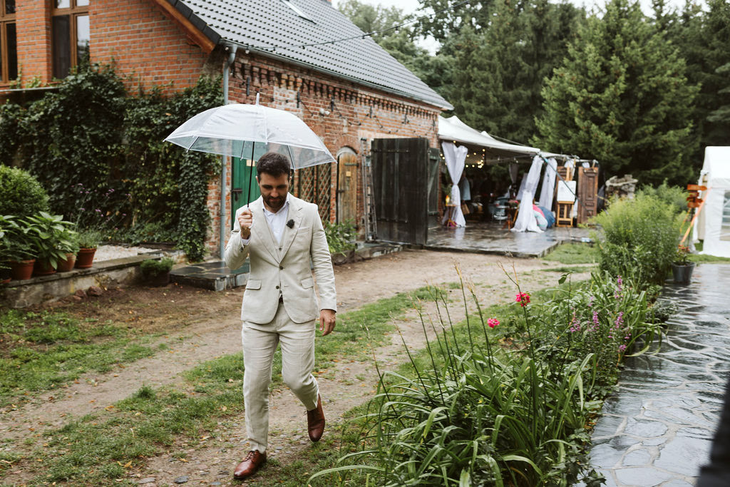Z Anią i Tiago poznaliśmy się na targach ślubnych i już od pierwszych chwil rozmawiało mi się z nimi bardzo miło i swobodnie. Klimaty brazylijskie są mi bliskie, bo kiedyś miałam ogromne szczęście pomieszkać w tym kraju, więc gdy tylko Ania&Tiago napisali do mnie, że wybrali mnie na swoją fotografkę ślubną od razu ucieszyłam się, że Brazylia znowu na chwilę pojawi się w moim życiu. Ale nie o mnie, opowiem Wam o pięknym ślubie i weselu Ani i Tiago, który odbywał się w Przyborowo 11. Najpierw przygotowania, kto mnie zna wie, że bardzo lubię tę część dnia podczas których szukam reportażowych smaczków. Podczas przygotowań u Ani i Tiago pełen luz… nikt się nie spieszy, kolega gra na gitarze w tle, ktoś podjada pizzę, w kuchni brazylijscy przyjaciele przygotowują słodkie przysmaki. Później zaczyna padać deszcz, ale kto by się tym przejmował – Ania jako świetnie zorganizowana osoba przewidziała taki scenariusz i pojawiają się dla gości fajne, przezroczyste parasole. Ślub humanistyczny Ani i Tiago – po prostu bajka, odczytanie pięknych wyznań miłości w towarzystwie przyjaciół jako celebrantów ślubu, mnóstwo śmiechu, wzruszeń, a nawet długie chwile wypełnione łzami szczęścia. A potem wspaniałe wesele przeplecione tradycjami polskimi, brazylijskimi, hiszpańskimi. Świetny moment gdy Tata Ani otwiera pet-nat wyprodukowany w winnicy Zodiak, która należy do rodziny Ani. Owacje dla Taty były na stojąco, bo co tu ukrywać takie fajne sceny to widzi się raczej w filmach, także tym bardziej chapeau bas dla Taty Ani. Potem super grupówki z rodziną i znajomymi na kanapie, która jakimś sposobem trafiła na skraj lasu. Za chwilę w oddali słychać już rozbrzmiewanie pierwszych dźwięków dancefloor-u, więc goście ruszają na parkiet, gdzie zaczyna dziać się taneczny „karnawał”. Zresztą sami zobaczcie, bo takie taneczne pląsy to lepiej zobaczyć niż opisywać.