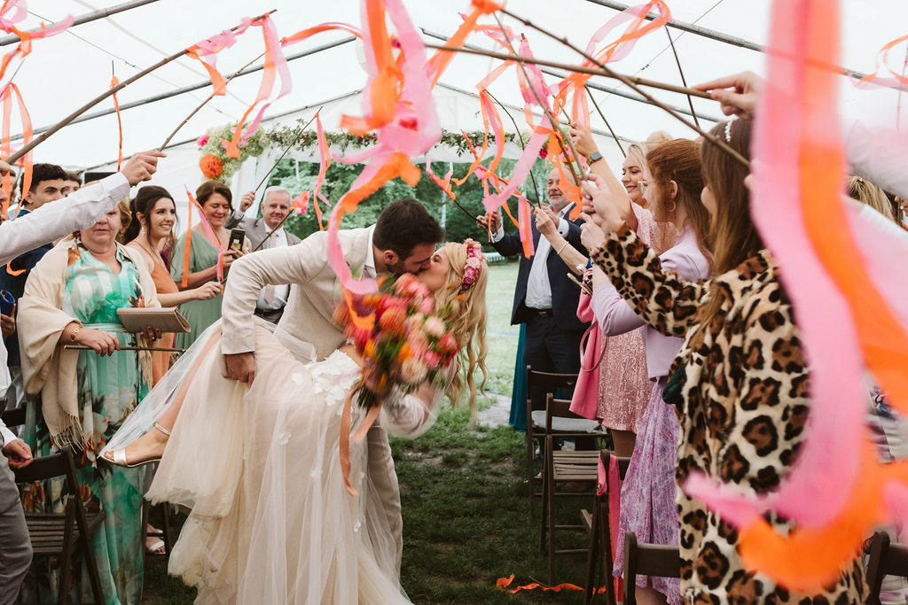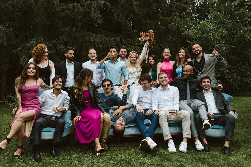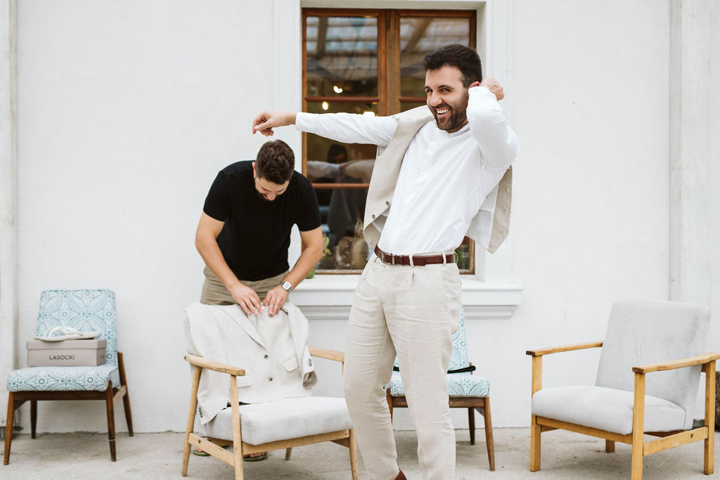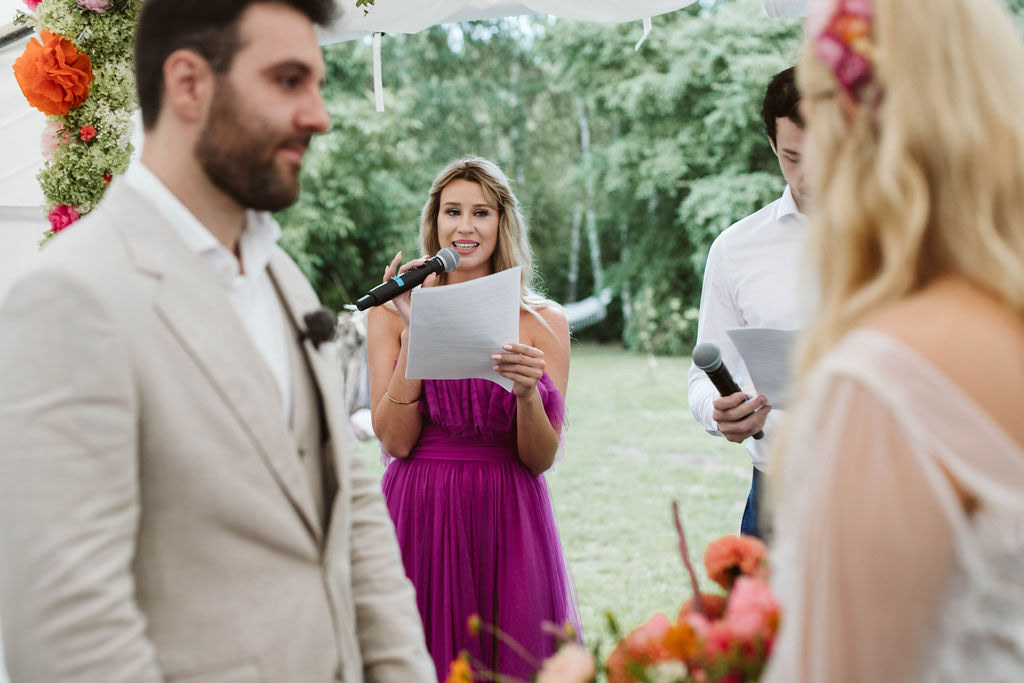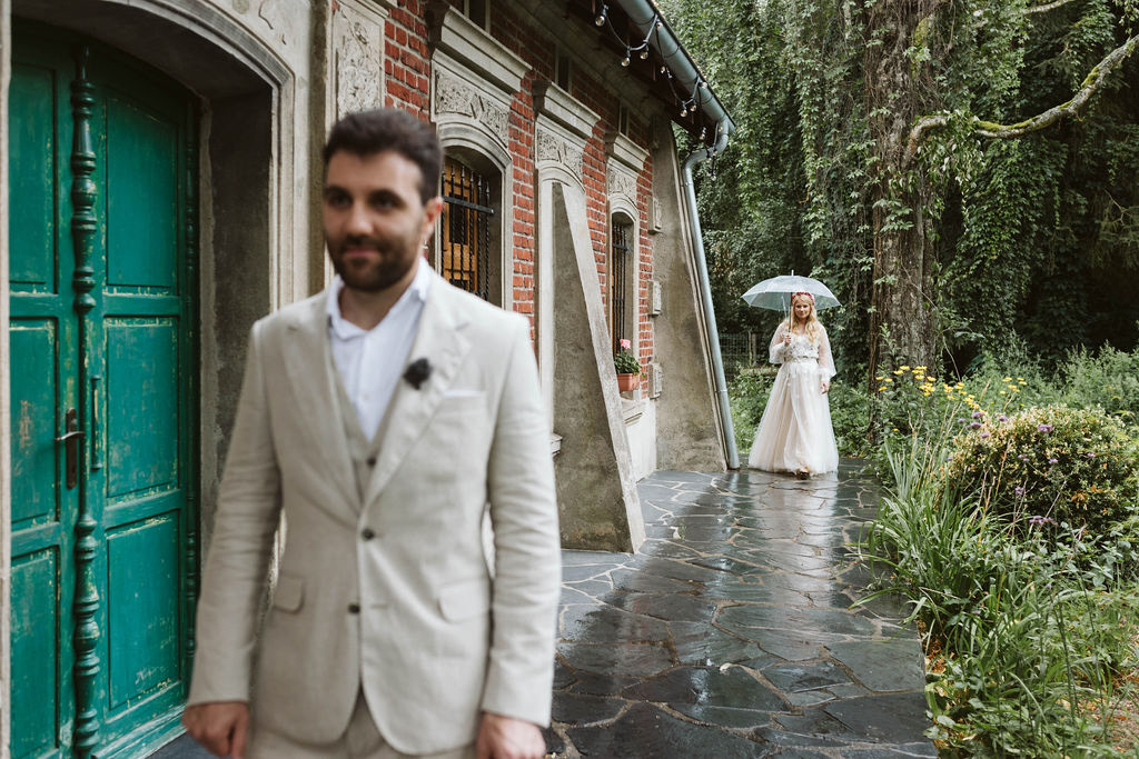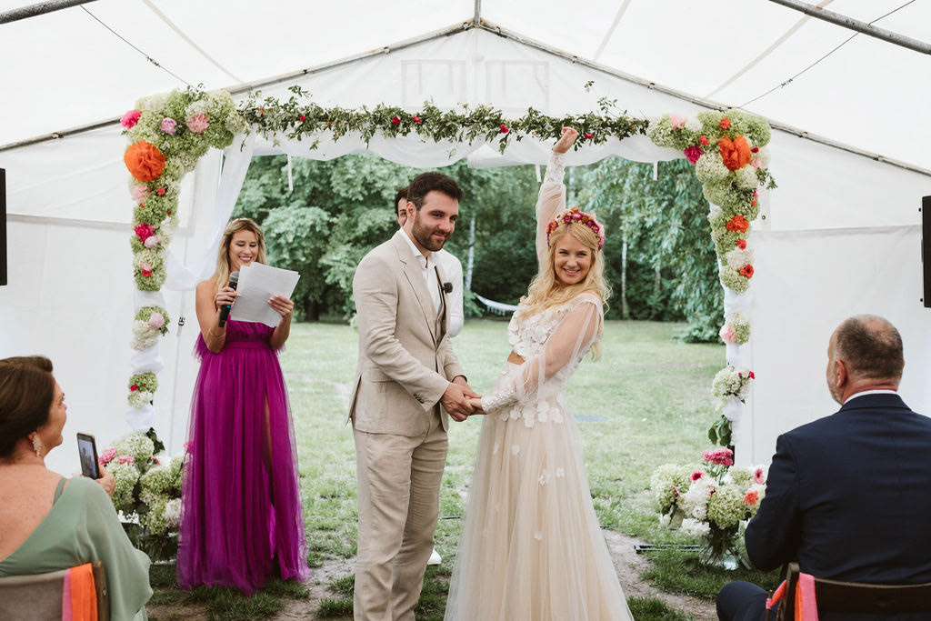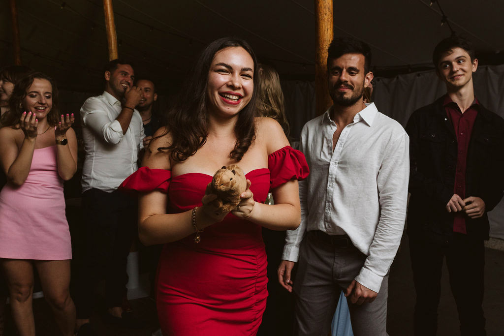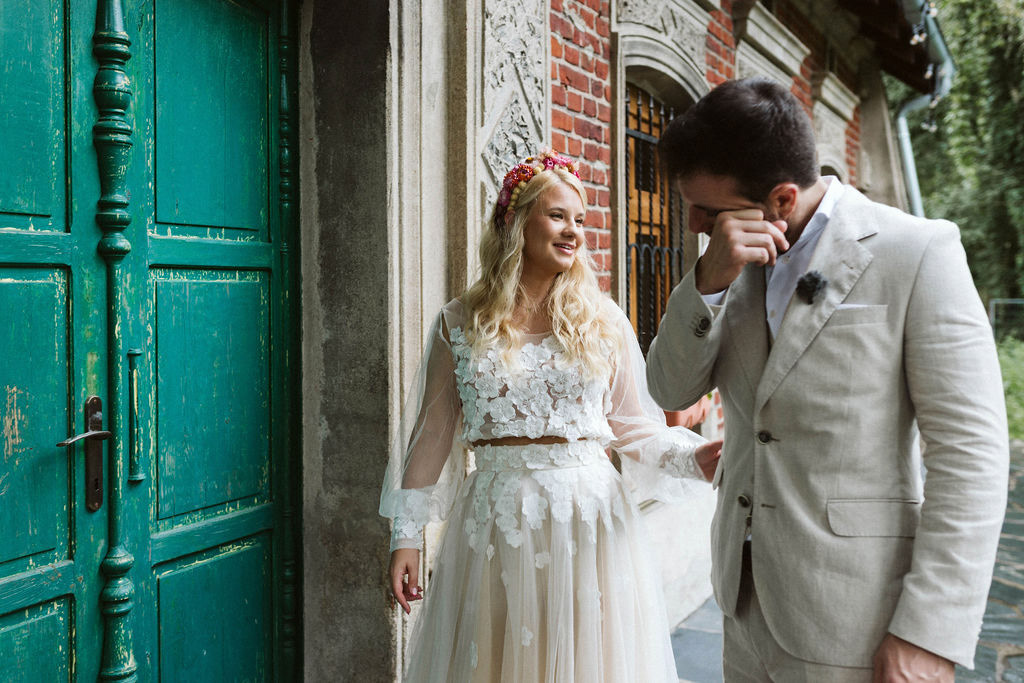 Z Anią i Tiago poznaliśmy się na targach ślubnych i już od pierwszych chwil rozmawiało mi się z nimi bardzo miło i swobodnie. Klimaty brazylijskie są mi bliskie, bo kiedyś miałam ogromne szczęście pomieszkać w tym kraju, więc gdy tylko Ania&Tiago napisali do mnie, że wybrali mnie na swoją fotografkę ślubną od razu ucieszyłam się, że Brazylia znowu na chwilę pojawi się w moim życiu. Ale nie o mnie, opowiem Wam o pięknym ślubie i weselu Ani i Tiago, który odbywał się w Przyborowo 11. Najpierw przygotowania, kto mnie zna wie, że bardzo lubię tę część dnia podczas których szukam reportażowych smaczków. Podczas przygotowań u Ani i Tiago pełen luz… nikt się nie spieszy, kolega gra na gitarze w tle, ktoś podjada pizzę, w kuchni brazylijscy przyjaciele przygotowują słodkie przysmaki. Później zaczyna padać deszcz, ale kto by się tym przejmował – Ania jako świetnie zorganizowana osoba przewidziała taki scenariusz i pojawiają się dla gości fajne, przezroczyste parasole. Ślub humanistyczny Ani i Tiago – po prostu bajka, odczytanie pięknych wyznań miłości w towarzystwie przyjaciół jako celebrantów ślubu, mnóstwo śmiechu, wzruszeń, a nawet długie chwile wypełnione łzami szczęścia. A potem wspaniałe wesele przeplecione tradycjami polskimi, brazylijskimi, hiszpańskimi. Świetny moment gdy Tata Ani otwiera pet-nat wyprodukowany w winnicy Zodiak, która należy do rodziny Ani. Owacje dla Taty były na stojąco, bo co tu ukrywać takie fajne sceny to widzi się raczej w filmach, także tym bardziej chapeau bas dla Taty Ani. Potem super grupówki z rodziną i znajomymi na kanapie, która jakimś sposobem trafiła na skraj lasu. Za chwilę w oddali słychać już rozbrzmiewanie pierwszych dźwięków dancefloor-u, więc goście ruszają na parkiet, gdzie zaczyna dziać się taneczny „karnawał”. Zresztą sami zobaczcie, bo takie taneczne pląsy to lepiej zobaczyć niż opisywać.