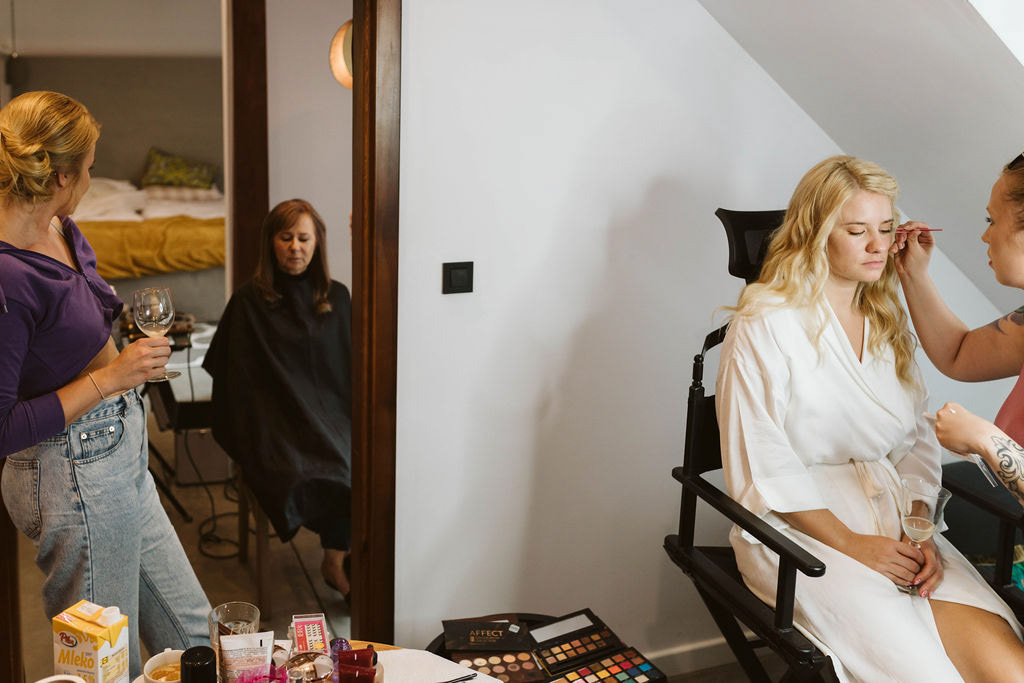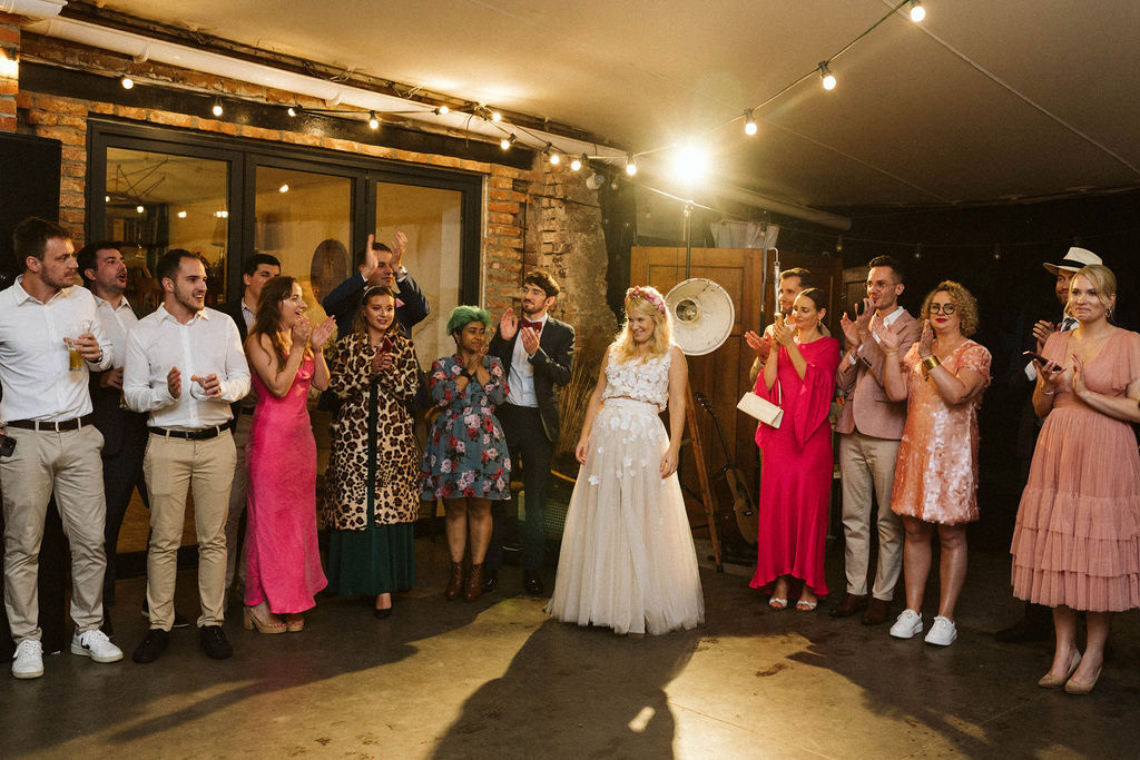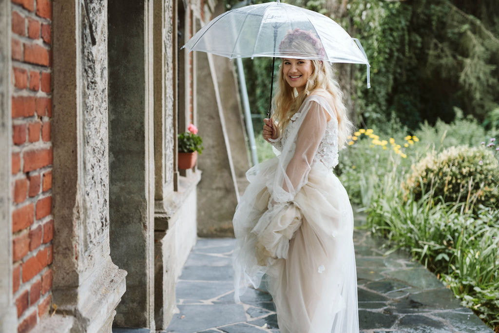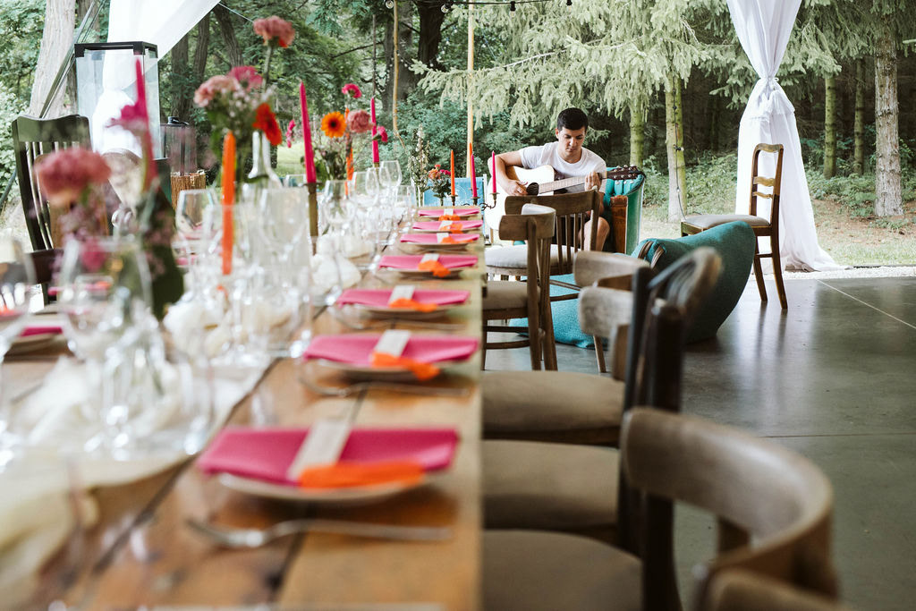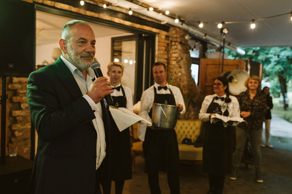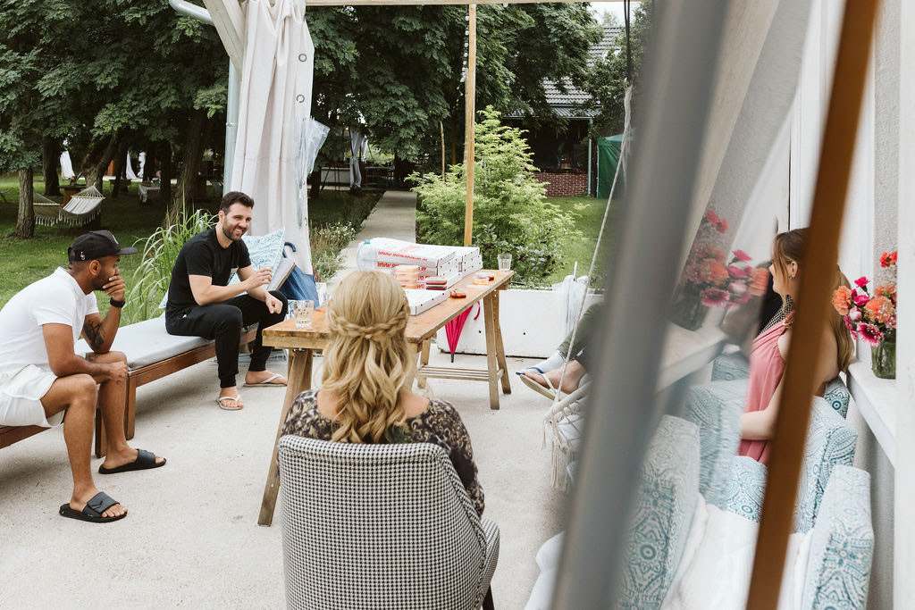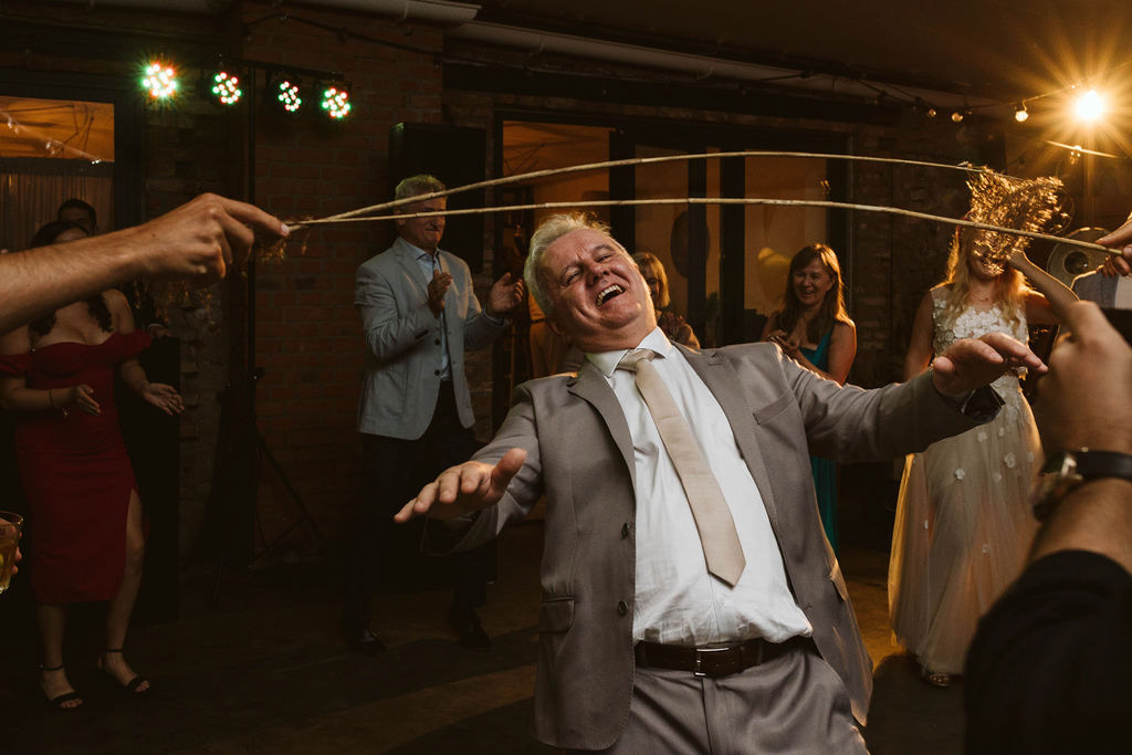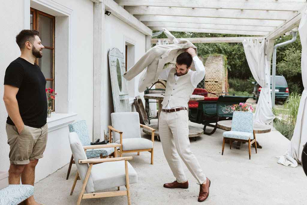 Z Anią i Tiago poznaliśmy się na targach ślubnych i już od pierwszych chwil rozmawiało mi się z nimi bardzo miło i swobodnie. Klimaty brazylijskie są mi bliskie, bo kiedyś miałam ogromne szczęście pomieszkać w tym kraju, więc gdy tylko Ania&Tiago napisali do mnie, że wybrali mnie na swoją fotografkę ślubną od razu ucieszyłam się, że Brazylia znowu na chwilę pojawi się w moim życiu. Ale nie o mnie, opowiem Wam o pięknym ślubie i weselu Ani i Tiago, który odbywał się w Przyborowo 11. Najpierw przygotowania, kto mnie zna wie, że bardzo lubię tę część dnia podczas których szukam reportażowych smaczków. Podczas przygotowań u Ani i Tiago pełen luz… nikt się nie spieszy, kolega gra na gitarze w tle, ktoś podjada pizzę, w kuchni brazylijscy przyjaciele przygotowują słodkie przysmaki. Później zaczyna padać deszcz, ale kto by się tym przejmował – Ania jako świetnie zorganizowana osoba przewidziała taki scenariusz i pojawiają się dla gości fajne, przezroczyste parasole. Ślub humanistyczny Ani i Tiago – po prostu bajka, odczytanie pięknych wyznań miłości w towarzystwie przyjaciół jako celebrantów ślubu, mnóstwo śmiechu, wzruszeń, a nawet długie chwile wypełnione łzami szczęścia. A potem wspaniałe wesele przeplecione tradycjami polskimi, brazylijskimi, hiszpańskimi. Świetny moment gdy Tata Ani otwiera pet-nat wyprodukowany w winnicy Zodiak, która należy do rodziny Ani. Owacje dla Taty były na stojąco, bo co tu ukrywać takie fajne sceny to widzi się raczej w filmach, także tym bardziej chapeau bas dla Taty Ani. Potem super grupówki z rodziną i znajomymi na kanapie, która jakimś sposobem trafiła na skraj lasu. Za chwilę w oddali słychać już rozbrzmiewanie pierwszych dźwięków dancefloor-u, więc goście ruszają na parkiet, gdzie zaczyna dziać się taneczny „karnawał”. Zresztą sami zobaczcie, bo takie taneczne pląsy to lepiej zobaczyć niż opisywać.
