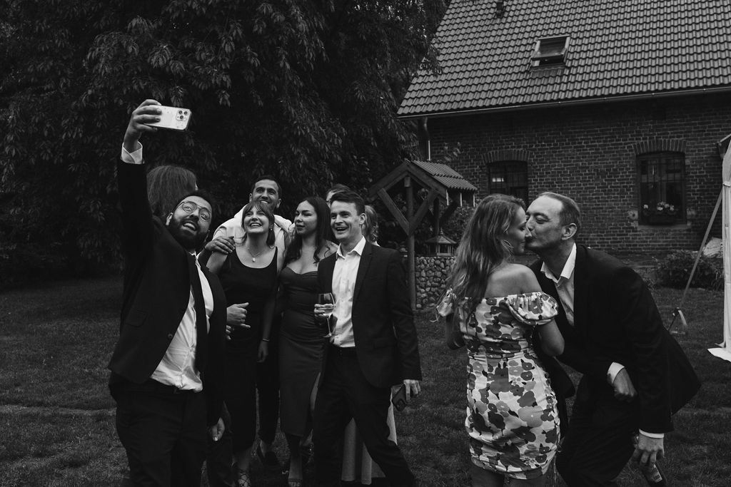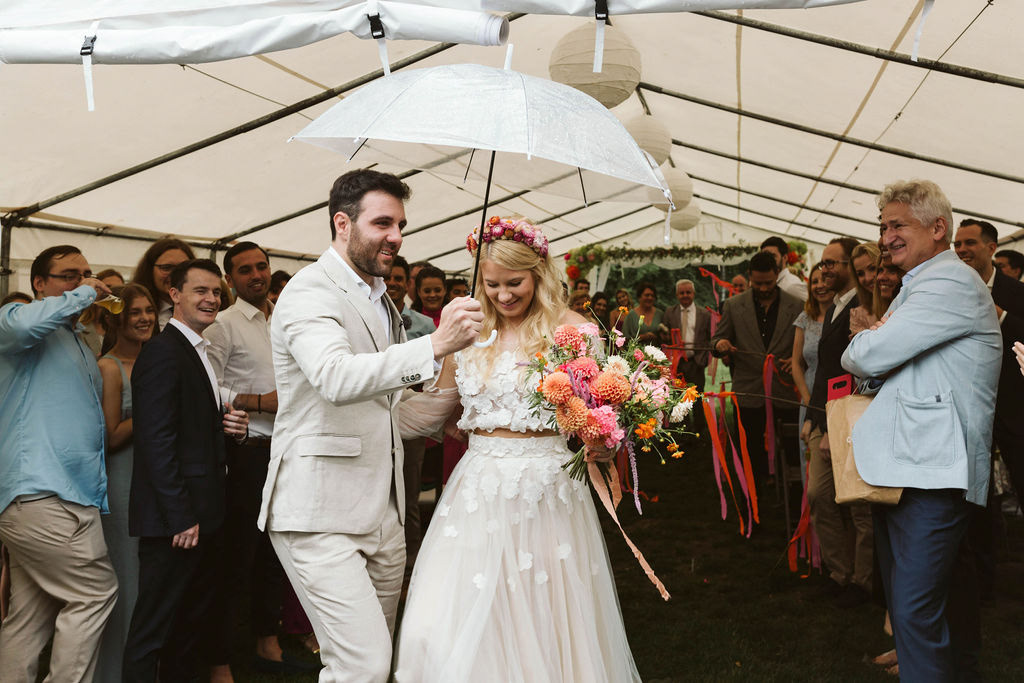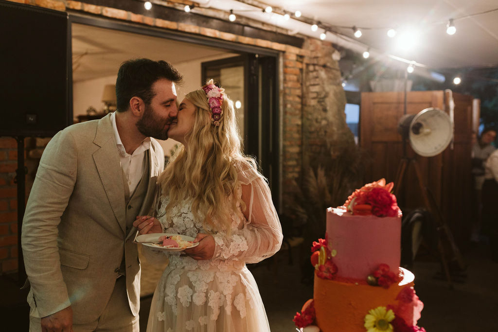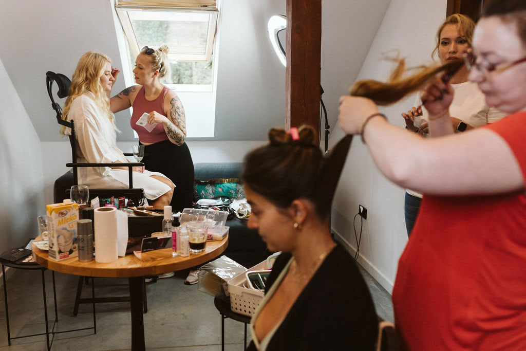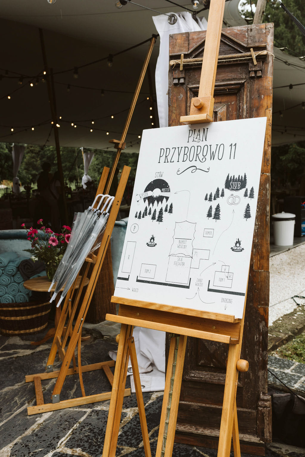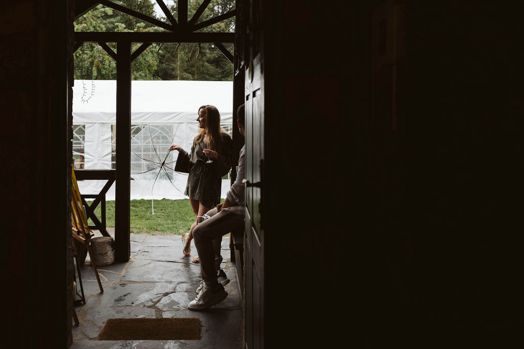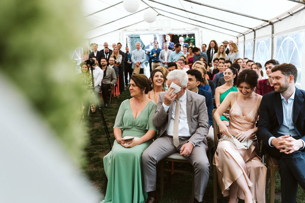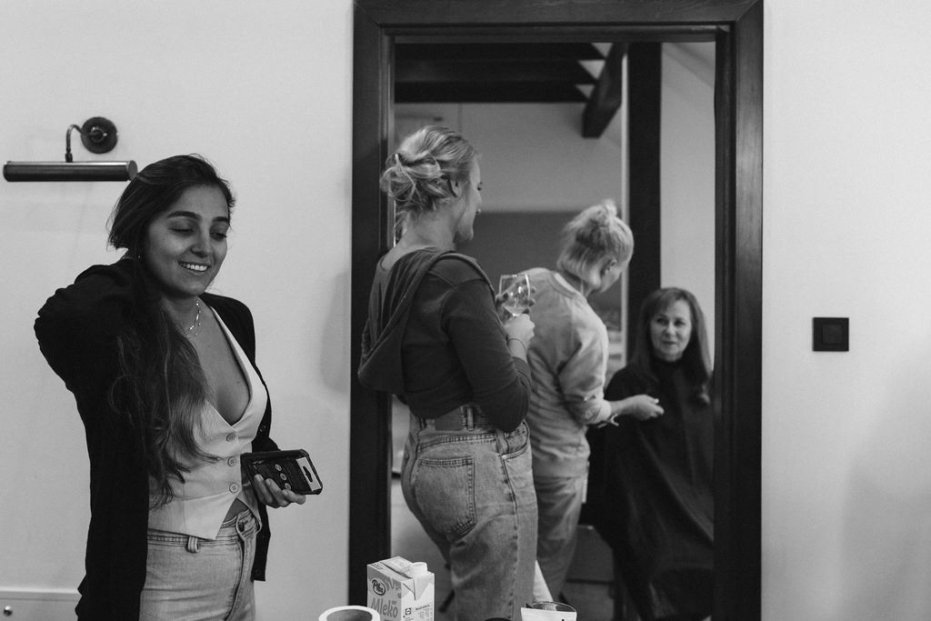 Z Anią i Tiago poznaliśmy się na targach ślubnych i już od pierwszych chwil rozmawiało mi się z nimi bardzo miło i swobodnie. Klimaty brazylijskie są mi bliskie, bo kiedyś miałam ogromne szczęście pomieszkać w tym kraju, więc gdy tylko Ania&Tiago napisali do mnie, że wybrali mnie na swoją fotografkę ślubną od razu ucieszyłam się, że Brazylia znowu na chwilę pojawi się w moim życiu. Ale nie o mnie, opowiem Wam o pięknym ślubie i weselu Ani i Tiago, który odbywał się w Przyborowo 11. Najpierw przygotowania, kto mnie zna wie, że bardzo lubię tę część dnia podczas których szukam reportażowych smaczków. Podczas przygotowań u Ani i Tiago pełen luz… nikt się nie spieszy, kolega gra na gitarze w tle, ktoś podjada pizzę, w kuchni brazylijscy przyjaciele przygotowują słodkie przysmaki. Później zaczyna padać deszcz, ale kto by się tym przejmował – Ania jako świetnie zorganizowana osoba przewidziała taki scenariusz i pojawiają się dla gości fajne, przezroczyste parasole. Ślub humanistyczny Ani i Tiago – po prostu bajka, odczytanie pięknych wyznań miłości w towarzystwie przyjaciół jako celebrantów ślubu, mnóstwo śmiechu, wzruszeń, a nawet długie chwile wypełnione łzami szczęścia. A potem wspaniałe wesele przeplecione tradycjami polskimi, brazylijskimi, hiszpańskimi. Świetny moment gdy Tata Ani otwiera pet-nat wyprodukowany w winnicy Zodiak, która należy do rodziny Ani. Owacje dla Taty były na stojąco, bo co tu ukrywać takie fajne sceny to widzi się raczej w filmach, także tym bardziej chapeau bas dla Taty Ani. Potem super grupówki z rodziną i znajomymi na kanapie, która jakimś sposobem trafiła na skraj lasu. Za chwilę w oddali słychać już rozbrzmiewanie pierwszych dźwięków dancefloor-u, więc goście ruszają na parkiet, gdzie zaczyna dziać się taneczny „karnawał”. Zresztą sami zobaczcie, bo takie taneczne pląsy to lepiej zobaczyć niż opisywać.