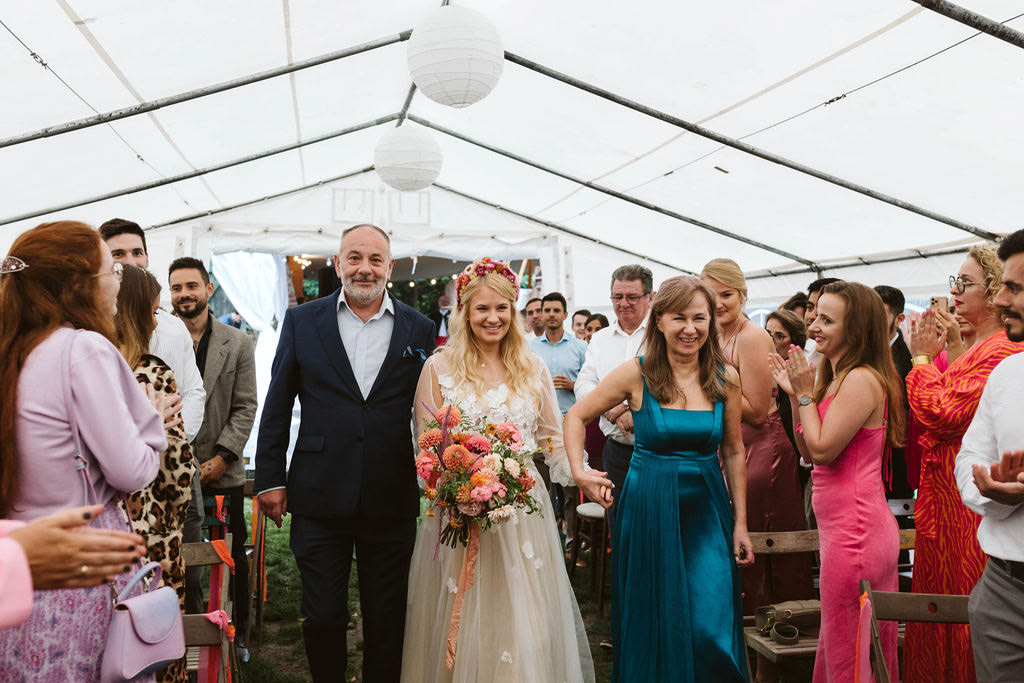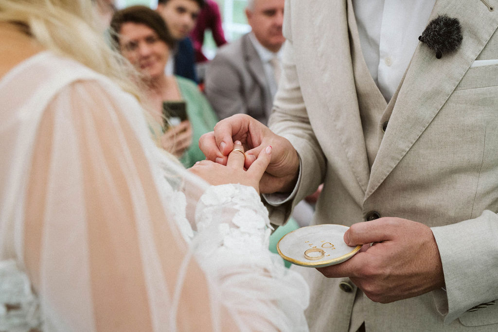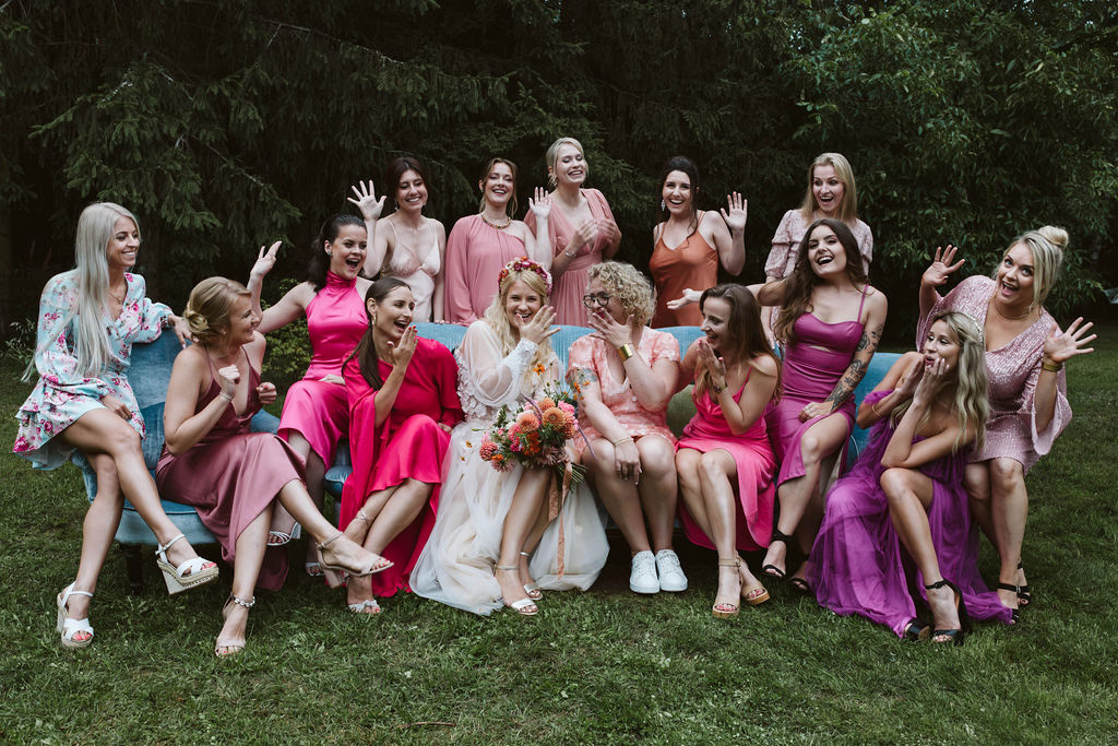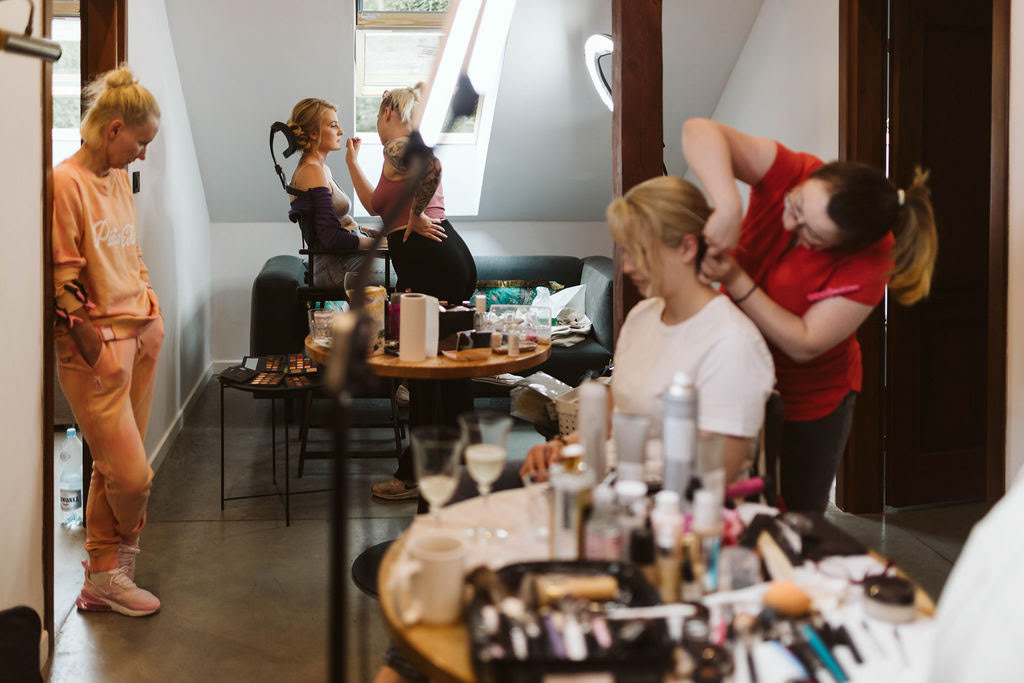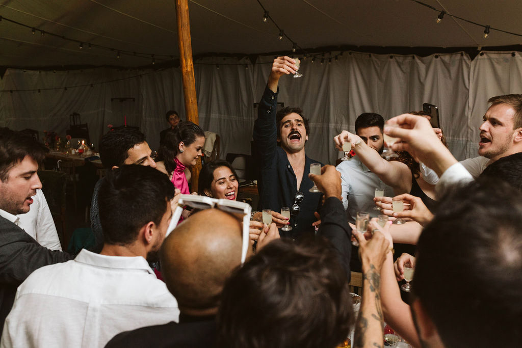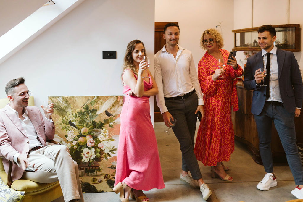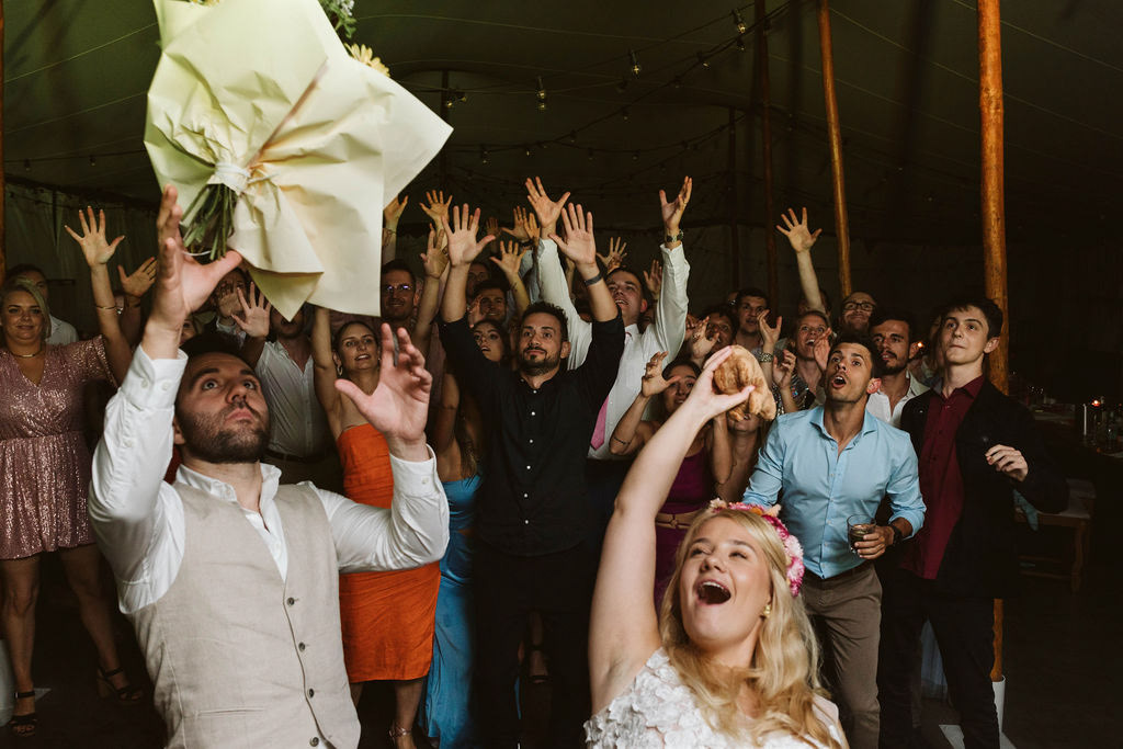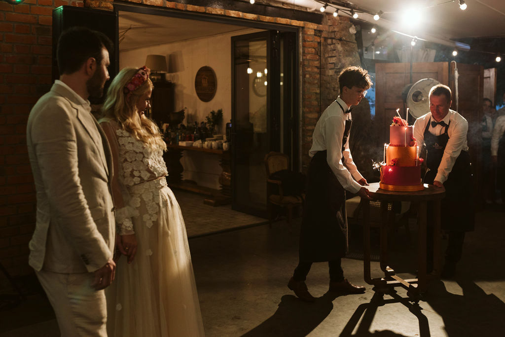 Z Anią i Tiago poznaliśmy się na targach ślubnych i już od pierwszych chwil rozmawiało mi się z nimi bardzo miło i swobodnie. Klimaty brazylijskie są mi bliskie, bo kiedyś miałam ogromne szczęście pomieszkać w tym kraju, więc gdy tylko Ania&Tiago napisali do mnie, że wybrali mnie na swoją fotografkę ślubną od razu ucieszyłam się, że Brazylia znowu na chwilę pojawi się w moim życiu. Ale nie o mnie, opowiem Wam o pięknym ślubie i weselu Ani i Tiago, który odbywał się w Przyborowo 11. Najpierw przygotowania, kto mnie zna wie, że bardzo lubię tę część dnia podczas których szukam reportażowych smaczków. Podczas przygotowań u Ani i Tiago pełen luz… nikt się nie spieszy, kolega gra na gitarze w tle, ktoś podjada pizzę, w kuchni brazylijscy przyjaciele przygotowują słodkie przysmaki. Później zaczyna padać deszcz, ale kto by się tym przejmował – Ania jako świetnie zorganizowana osoba przewidziała taki scenariusz i pojawiają się dla gości fajne, przezroczyste parasole. Ślub humanistyczny Ani i Tiago – po prostu bajka, odczytanie pięknych wyznań miłości w towarzystwie przyjaciół jako celebrantów ślubu, mnóstwo śmiechu, wzruszeń, a nawet długie chwile wypełnione łzami szczęścia. A potem wspaniałe wesele przeplecione tradycjami polskimi, brazylijskimi, hiszpańskimi. Świetny moment gdy Tata Ani otwiera pet-nat wyprodukowany w winnicy Zodiak, która należy do rodziny Ani. Owacje dla Taty były na stojąco, bo co tu ukrywać takie fajne sceny to widzi się raczej w filmach, także tym bardziej chapeau bas dla Taty Ani. Potem super grupówki z rodziną i znajomymi na kanapie, która jakimś sposobem trafiła na skraj lasu. Za chwilę w oddali słychać już rozbrzmiewanie pierwszych dźwięków dancefloor-u, więc goście ruszają na parkiet, gdzie zaczyna dziać się taneczny „karnawał”. Zresztą sami zobaczcie, bo takie taneczne pląsy to lepiej zobaczyć niż opisywać.