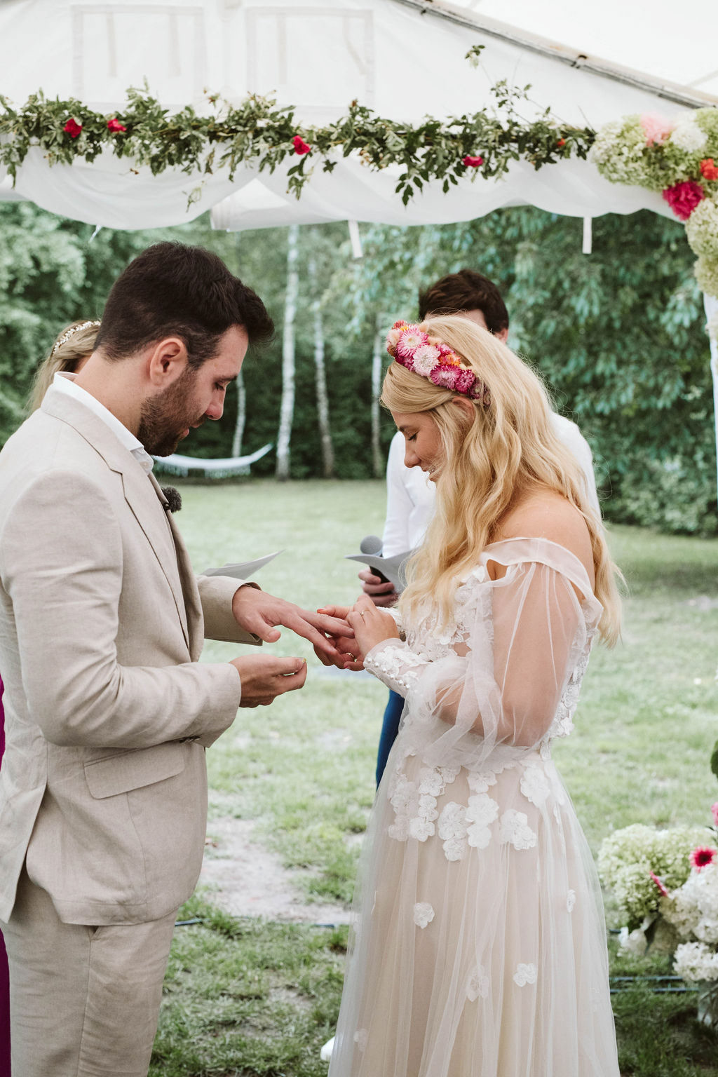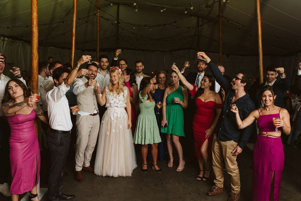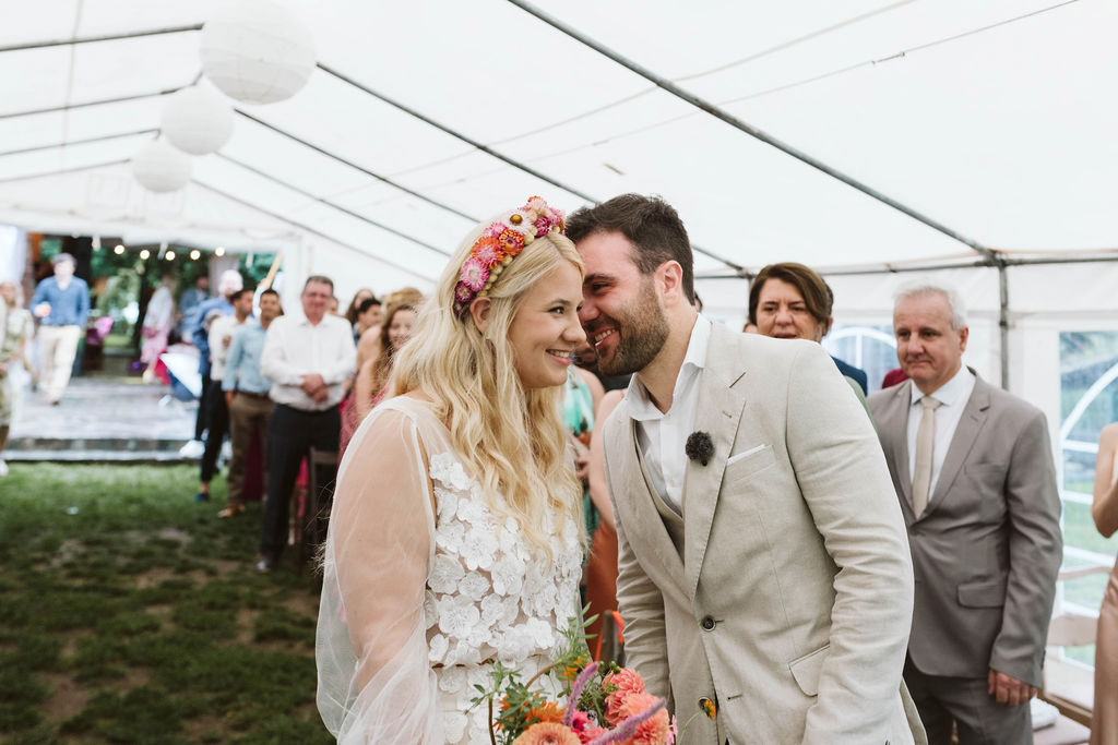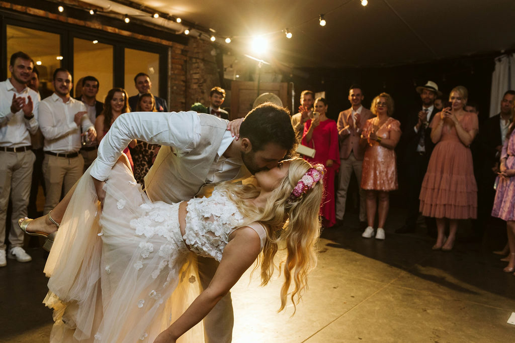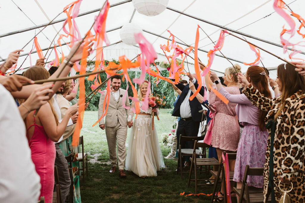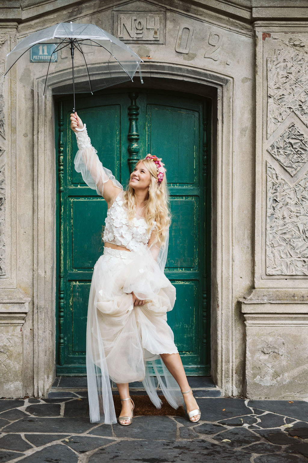 Z Anią i Tiago poznaliśmy się na targach ślubnych i już od pierwszych chwil rozmawiało mi się z nimi bardzo miło i swobodnie. Klimaty brazylijskie są mi bliskie, bo kiedyś miałam ogromne szczęście pomieszkać w tym kraju, więc gdy tylko Ania&Tiago napisali do mnie, że wybrali mnie na swoją fotografkę ślubną od razu ucieszyłam się, że Brazylia znowu na chwilę pojawi się w moim życiu. Ale nie o mnie, opowiem Wam o pięknym ślubie i weselu Ani i Tiago, który odbywał się w Przyborowo 11. Najpierw przygotowania, kto mnie zna wie, że bardzo lubię tę część dnia podczas których szukam reportażowych smaczków. Podczas przygotowań u Ani i Tiago pełen luz… nikt się nie spieszy, kolega gra na gitarze w tle, ktoś podjada pizzę, w kuchni brazylijscy przyjaciele przygotowują słodkie przysmaki. Później zaczyna padać deszcz, ale kto by się tym przejmował – Ania jako świetnie zorganizowana osoba przewidziała taki scenariusz i pojawiają się dla gości fajne, przezroczyste parasole. Ślub humanistyczny Ani i Tiago – po prostu bajka, odczytanie pięknych wyznań miłości w towarzystwie przyjaciół jako celebrantów ślubu, mnóstwo śmiechu, wzruszeń, a nawet długie chwile wypełnione łzami szczęścia. A potem wspaniałe wesele przeplecione tradycjami polskimi, brazylijskimi, hiszpańskimi. Świetny moment gdy Tata Ani otwiera pet-nat wyprodukowany w winnicy Zodiak, która należy do rodziny Ani. Owacje dla Taty były na stojąco, bo co tu ukrywać takie fajne sceny to widzi się raczej w filmach, także tym bardziej chapeau bas dla Taty Ani. Potem super grupówki z rodziną i znajomymi na kanapie, która jakimś sposobem trafiła na skraj lasu. Za chwilę w oddali słychać już rozbrzmiewanie pierwszych dźwięków dancefloor-u, więc goście ruszają na parkiet, gdzie zaczyna dziać się taneczny „karnawał”. Zresztą sami zobaczcie, bo takie taneczne pląsy to lepiej zobaczyć niż opisywać.