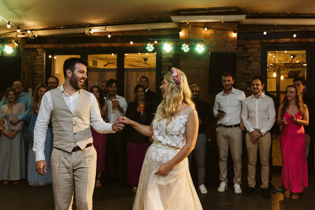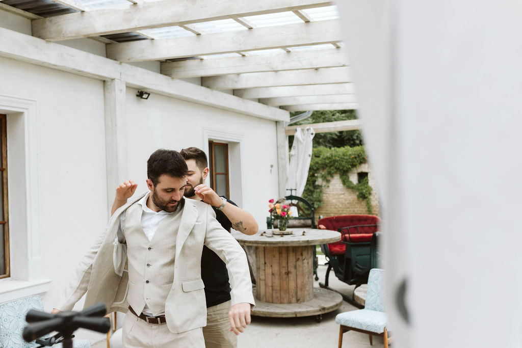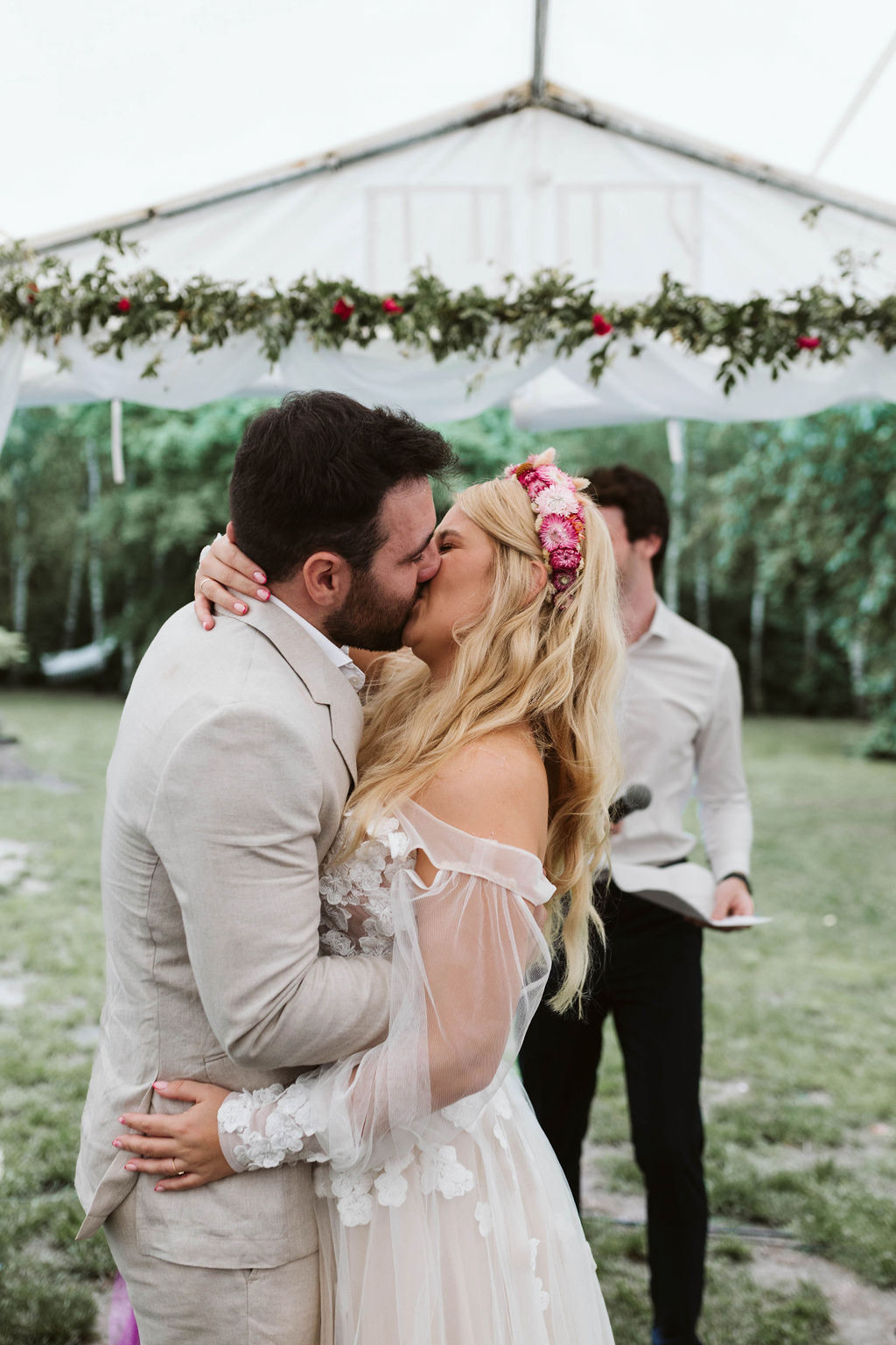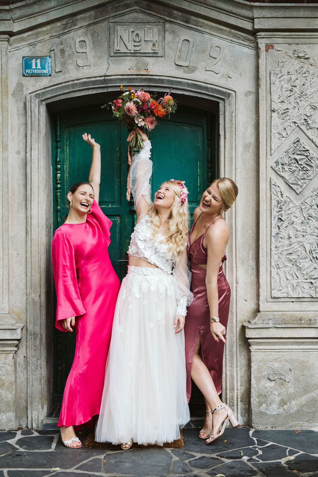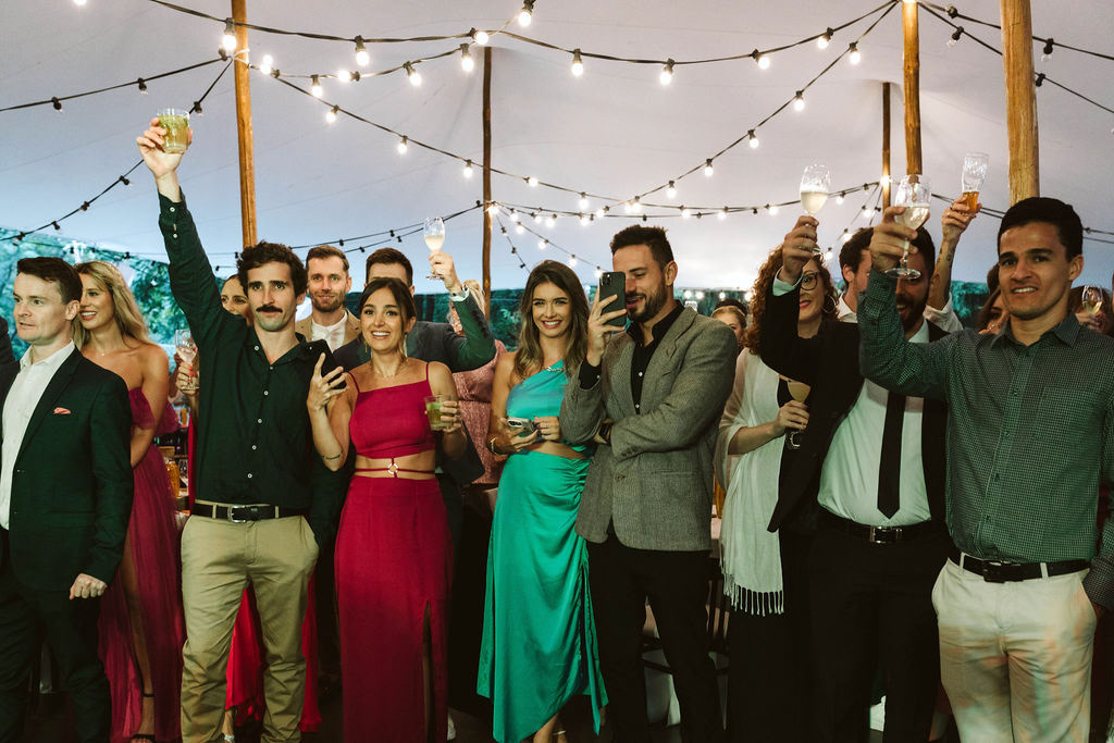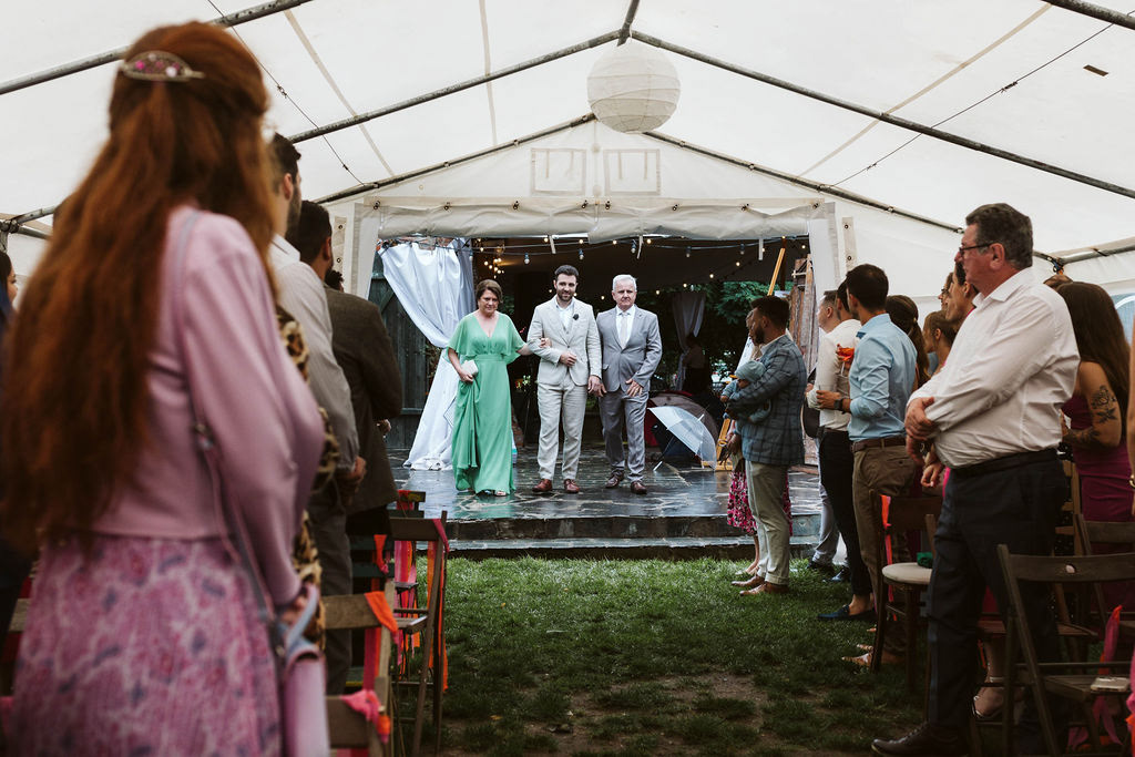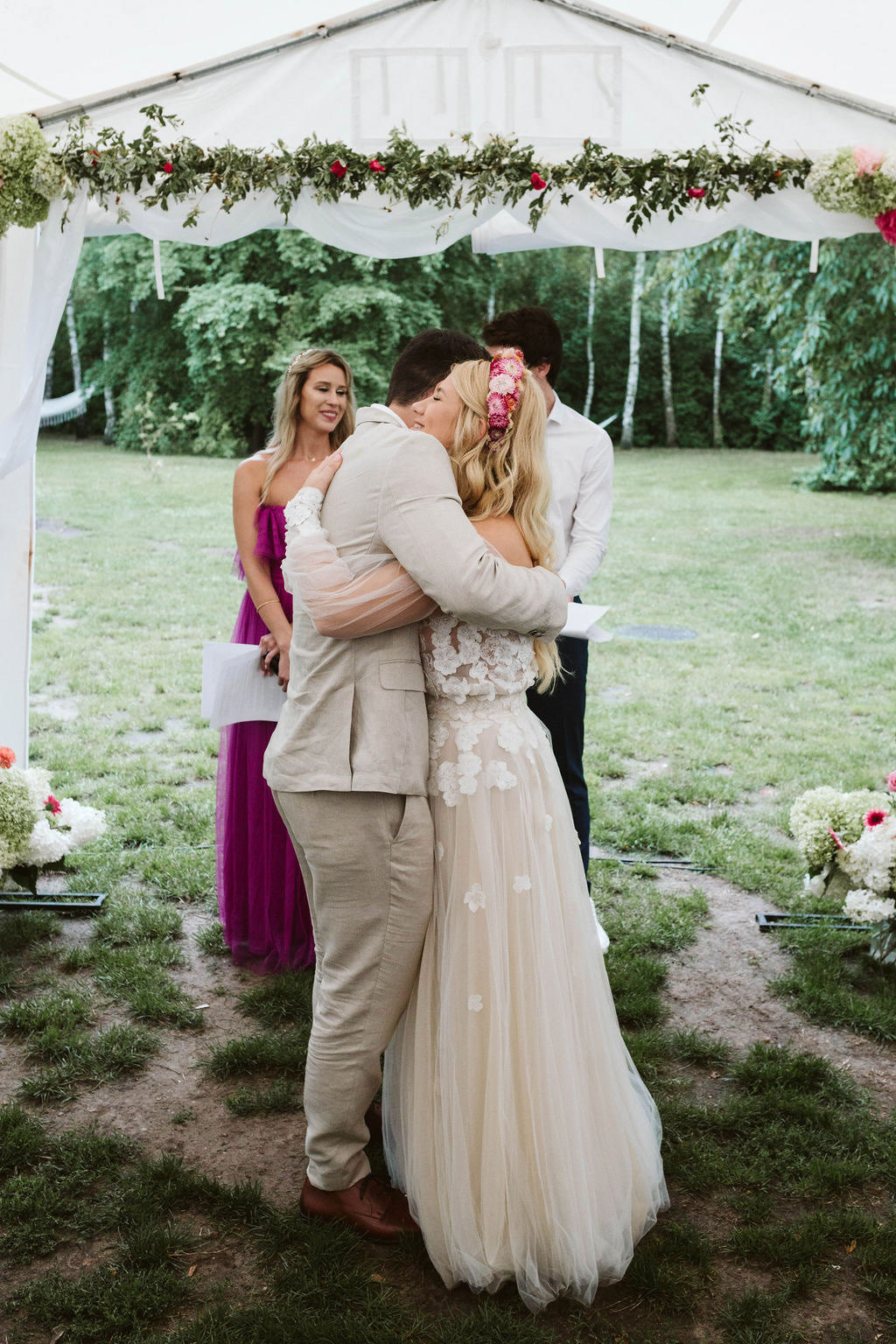 Z Anią i Tiago poznaliśmy się na targach ślubnych i już od pierwszych chwil rozmawiało mi się z nimi bardzo miło i swobodnie. Klimaty brazylijskie są mi bliskie, bo kiedyś miałam ogromne szczęście pomieszkać w tym kraju, więc gdy tylko Ania&Tiago napisali do mnie, że wybrali mnie na swoją fotografkę ślubną od razu ucieszyłam się, że Brazylia znowu na chwilę pojawi się w moim życiu. Ale nie o mnie, opowiem Wam o pięknym ślubie i weselu Ani i Tiago, który odbywał się w Przyborowo 11. Najpierw przygotowania, kto mnie zna wie, że bardzo lubię tę część dnia podczas których szukam reportażowych smaczków. Podczas przygotowań u Ani i Tiago pełen luz… nikt się nie spieszy, kolega gra na gitarze w tle, ktoś podjada pizzę, w kuchni brazylijscy przyjaciele przygotowują słodkie przysmaki. Później zaczyna padać deszcz, ale kto by się tym przejmował – Ania jako świetnie zorganizowana osoba przewidziała taki scenariusz i pojawiają się dla gości fajne, przezroczyste parasole. Ślub humanistyczny Ani i Tiago – po prostu bajka, odczytanie pięknych wyznań miłości w towarzystwie przyjaciół jako celebrantów ślubu, mnóstwo śmiechu, wzruszeń, a nawet długie chwile wypełnione łzami szczęścia. A potem wspaniałe wesele przeplecione tradycjami polskimi, brazylijskimi, hiszpańskimi. Świetny moment gdy Tata Ani otwiera pet-nat wyprodukowany w winnicy Zodiak, która należy do rodziny Ani. Owacje dla Taty były na stojąco, bo co tu ukrywać takie fajne sceny to widzi się raczej w filmach, także tym bardziej chapeau bas dla Taty Ani. Potem super grupówki z rodziną i znajomymi na kanapie, która jakimś sposobem trafiła na skraj lasu. Za chwilę w oddali słychać już rozbrzmiewanie pierwszych dźwięków dancefloor-u, więc goście ruszają na parkiet, gdzie zaczyna dziać się taneczny „karnawał”. Zresztą sami zobaczcie, bo takie taneczne pląsy to lepiej zobaczyć niż opisywać.